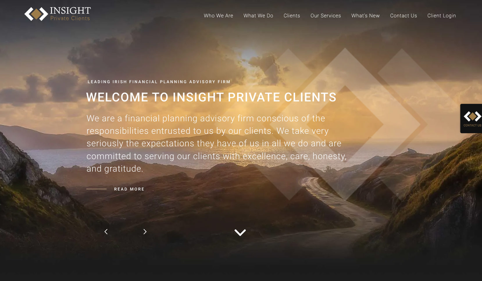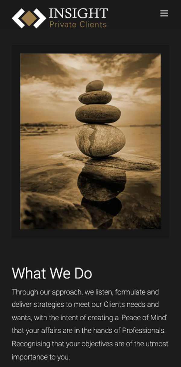 Insight Private Clients came to Insight Multimedia by ‘word of mouth‘ (as do many of our clients). They had heard that we like to combine good visual design skills with good code development. They had been recommended to talk to us by two of our existing clients who, we had been working with for over 10 years. Insight Private Client had a particular design style in mind for their new website. They were very quick to point out that they didn’t want the ‘typical’ financial advise, industry standard look for their new website. They wanted us to think out of the box and present a look that would separate them from the typical ‘run of the mill’ crowd (exactly what we like to hear). So our senior graphic designer, Monika Molga went to work… she had a clear vision in mind ‘as had been set out by the client’… and lets face is … she NAILED it… She totally got that WOW factor that the client was looking for.