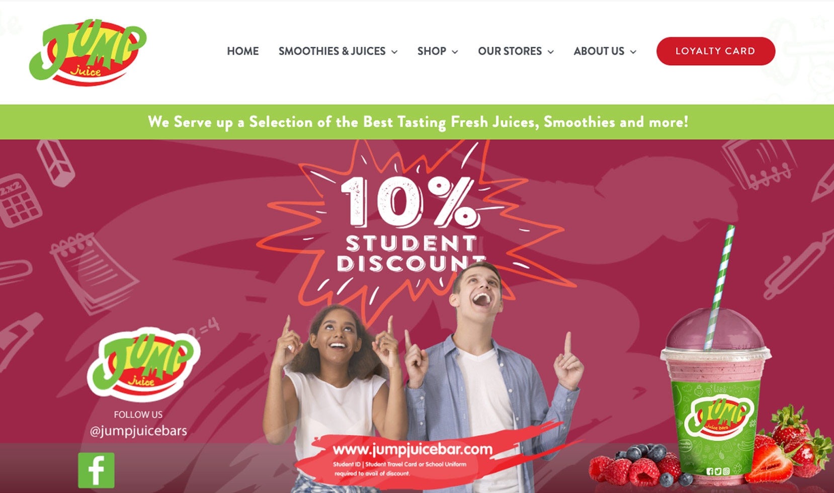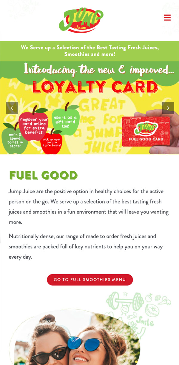 Jump Juice bars are the positive option in healthy choices for the active person on the go. They serve up a selection of the best tasting fresh juices and smoothies in a fun environment that will leave you wanting more. Nutritionally dense our range of made to order fresh juices and smoothies are packed full of key nutrients to help you on your way every day.